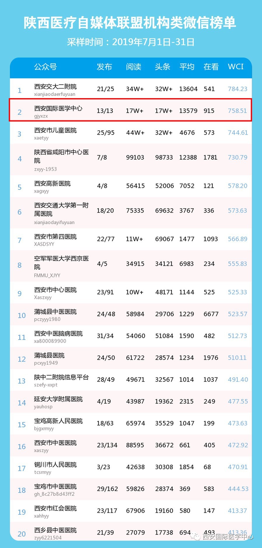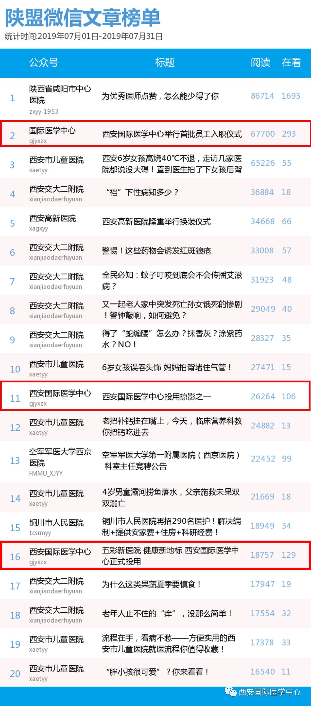 8月2日,中國醫(yī)療自媒體聯(lián)盟陜西分盟醫(yī)療機構類微信公眾號7月份排行榜發(fā)布,西安國際醫(yī)學中心微信公眾號奪得醫(yī)療機構類榜單第2名,高居“榜眼”。在陜西醫(yī)療自媒體聯(lián)盟的推薦下,西安國際醫(yī)學中心順利進入今日頭條號(醫(yī)療機構),微信文章將同步刊登到今日頭條。