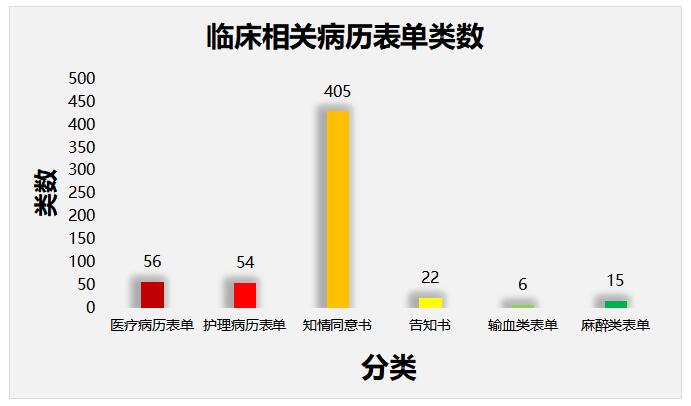 根據(jù)JCI第六版評審標準,完成JCI相關醫(yī)療病歷表單類56類,JCI相關護理病歷表單54類、知情同意書405類、告知書22類、輸血類表單6類、麻醉類表單15類,總計583類。如圖所示: