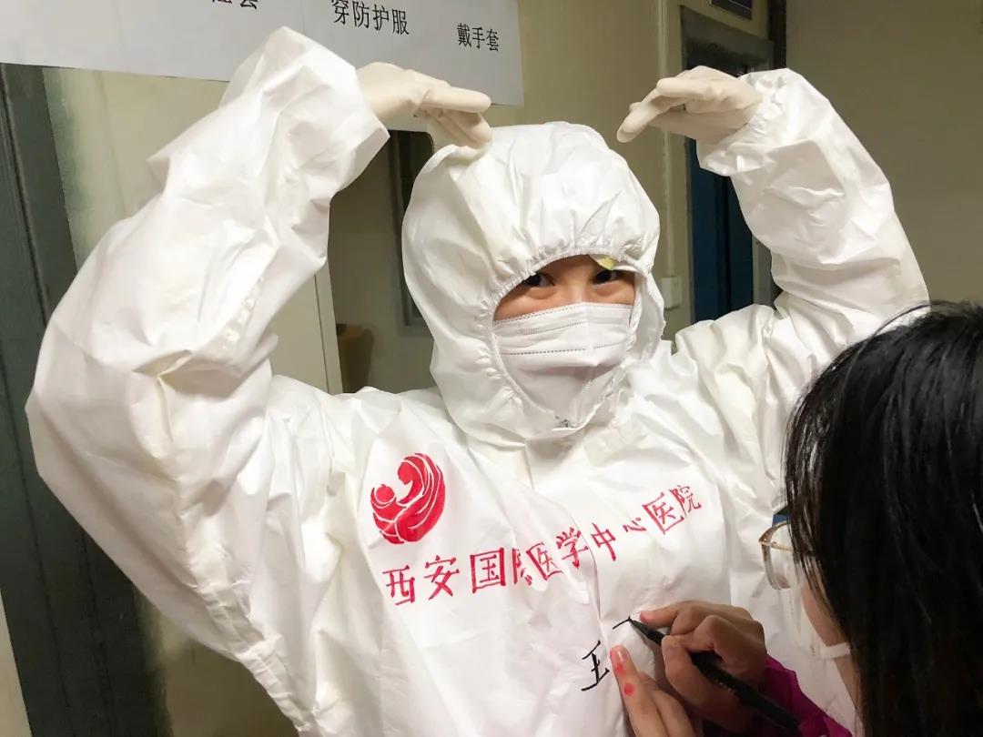 西安國際醫(yī)學(xué)中心醫(yī)院援鄂醫(yī)療隊醫(yī)護隊員都有一身特別的白袍,手繪版防護服上有國際醫(yī)學(xué)的logo?!安猾@全勝絕不輕言成功”、“武漢加油”的娟秀字跡提升士氣,醫(yī)護人員擊敗新冠病毒的漫畫也鼓舞人心。