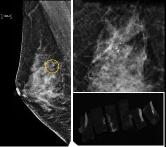46歲的某女士在西安國(guó)際醫(yī)學(xué)中心醫(yī)院體檢時(shí),行乳腺X線攝影(俗稱鉬靶)發(fā)現(xiàn)右乳可疑簇狀鈣化,分布范圍不到1厘米,臨床觸不到,超聲很難發(fā)現(xiàn),但是這種鈣化風(fēng)險(xiǎn)比較高,依據(jù)國(guó)際BI-RADS指南需要明確病理!