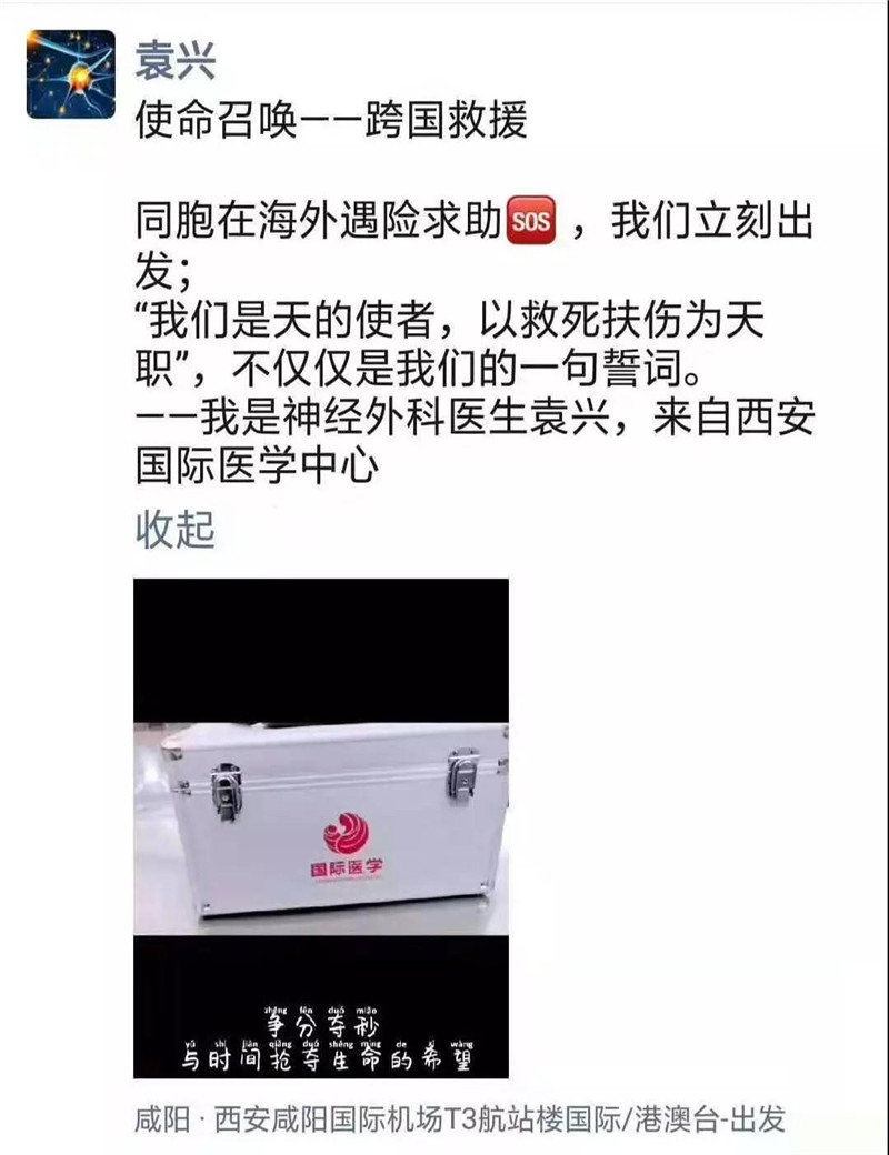 一場(chǎng)由網(wǎng)友自發(fā)的愛(ài)心接力,在網(wǎng)絡(luò)上、朋友圈中傳播,大家伸出援手,將愛(ài)心匯聚成暖流,小高母親的病情也牽動(dòng)著西安國(guó)際醫(yī)學(xué)中心醫(yī)院腦科醫(yī)院神經(jīng)外科主任賀世明的心。12月2日,得知小高一家的處境后,賀世明主任立即報(bào)告醫(yī)院,在了解了患者的病情和現(xiàn)狀后,經(jīng)過(guò)綜合考慮,醫(yī)院迅速啟動(dòng)首次國(guó)際救援,準(zhǔn)備了急救藥品、便攜設(shè)備,立即派出神經(jīng)外科袁興醫(yī)生連夜出發(fā),前往泰國(guó)進(jìn)行緊急救治,開(kāi)啟了一場(chǎng)跨國(guó)救援的大愛(ài)之旅。