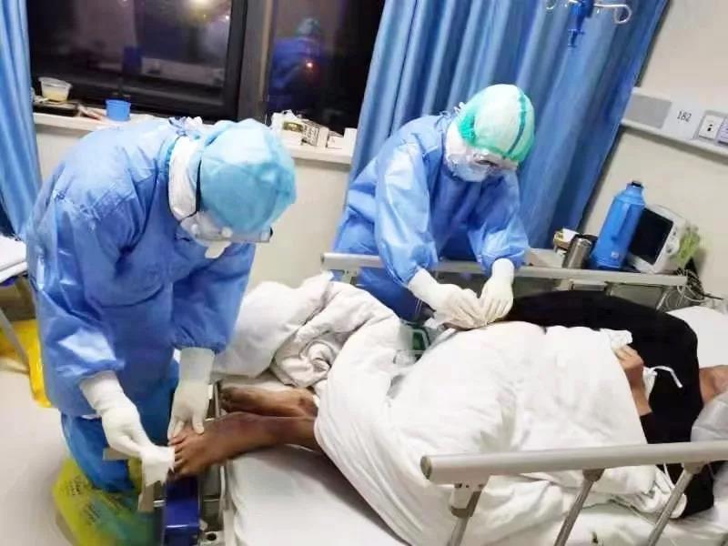 每名隊員穿著厚重的防護(hù)衣,來回穿梭在戰(zhàn)斗的最前線。病區(qū)沒有陪護(hù),又以高齡老年行動不便的患者居多,都佩戴鼻氧管或者儲氧面罩,更有甚者佩戴無創(chuàng)呼吸機(jī)。護(hù)理人員不僅要不停地巡視病房,更要協(xié)助病人在床上大小便,為患者翻身、送飯、打水,要服藥到口,測量生命體征等。時間久了,護(hù)目鏡里全都是水,這樣就對靜脈采血和留置針穿刺成功率帶來了難度,他們憑借著扎實(shí)的專業(yè)技術(shù)功底和多年的臨床經(jīng)驗,一次又一次的一針見血,每班下來,每個人內(nèi)穿衣已經(jīng)全部濕透,臉上被壓的滿是皺褶,這樣的場景對他們來說,再平常不過。