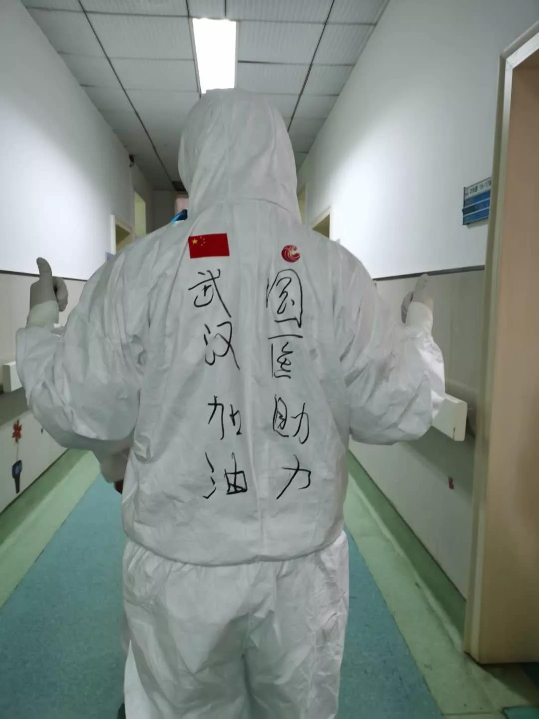 培訓(xùn)后的隊員開始穿戴防護(hù)服,由于身著防護(hù)服,看不清彼此的面容,醫(yī)護(hù)人員在防護(hù)服上背后寫上自己的姓名,一個個化身暖心“大白”,彼此加油打氣,“武漢加油、國醫(yī)加油!”一字一句鼓舞人心,充滿力量。面對疫情和種種未知的風(fēng)險,西安國際醫(yī)學(xué)中心醫(yī)院醫(yī)療隊隊員主動請纓,勇于上前,他們是最美逆行者!