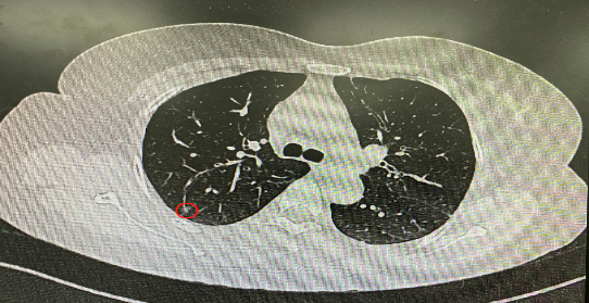 今年54歲的李女士(化名)7月初突然出現(xiàn)右上部腹痛,起初并未在意,以為稍作休息就會好轉(zhuǎn),但疼痛卻并未消退,持續(xù)了一個星期。李女士實(shí)在難以忍受,才在家人陪伴下來到西安國際醫(yī)學(xué)中心醫(yī)院就診。胸外科二病區(qū)崔凱主任接診患者后,詳細(xì)詢問病情并查閱檢查資料,經(jīng)胸部HRCT檢查,結(jié)果提示:右肺上葉后段混合密度結(jié)節(jié)影,考慮原位癌可能,即將患者收入胸腔外科二病區(qū)住院治療。