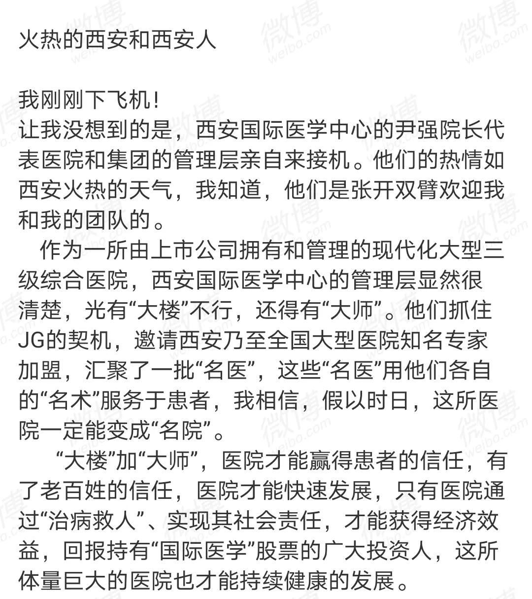 “讓我沒想到的是,西安國際醫(yī)學(xué)中心醫(yī)院的尹強(qiáng)院長代表醫(yī)院和集團(tuán)的管理層親自來接機(jī),我知道,他們是張開雙臂歡迎我和我的團(tuán)隊(duì)的?!边@是郭樹忠教授加盟該院時(shí),在機(jī)場(chǎng)發(fā)布的一條微博。