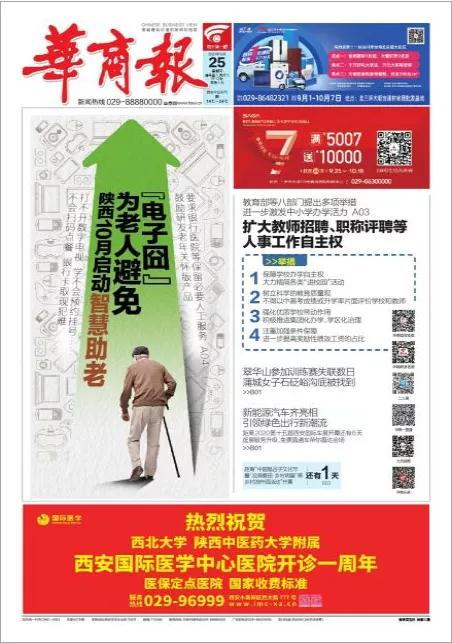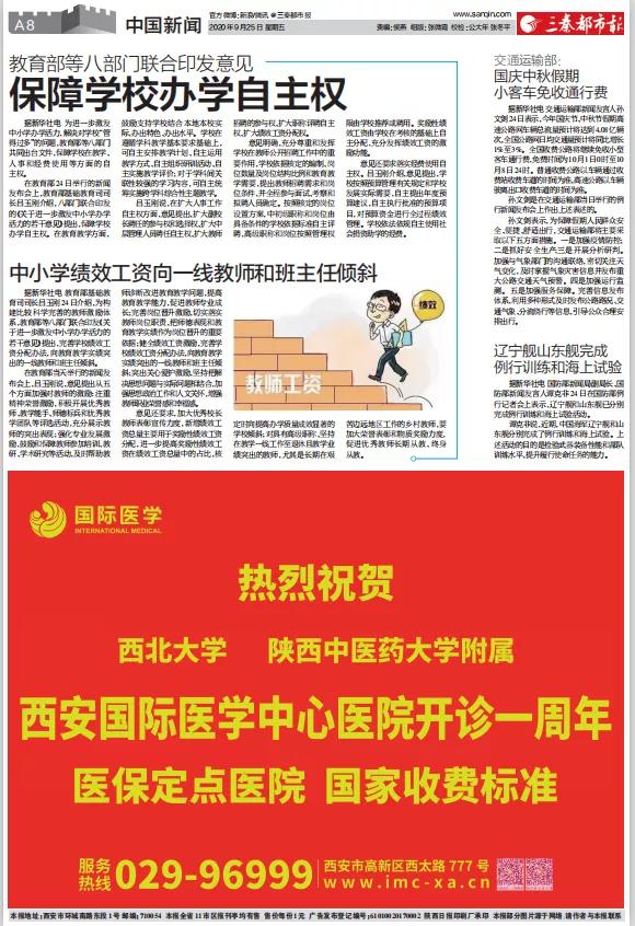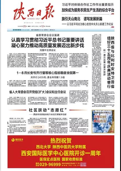 2020年9月25日,在西安國際醫(yī)學(xué)中心醫(yī)院一周歲生日之際,陜西日報、西安晚報、華商報、三秦都市報、陽光報分別刊文送上生日祝福。