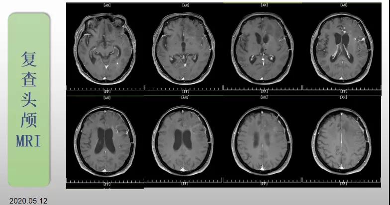 70歲的郝女士去年曾在外院查出“左額島葉”膠質(zhì)母細胞瘤(WHO Ⅳ級),并做了左側(cè)額島葉占位性病變切除術(shù)。術(shù)后進行了同步放化療。由于治療條件有限,郝女士慕名來到我院就診。賀世明主任率領(lǐng)醫(yī)護團隊立即為郝女士進行了全面的檢查,決定為其進行綜合治療 電場治療。經(jīng)過三個多月的綜合治療,患者復(fù)查頭顱MRI病變較前明顯縮小。出院時,郝女士神志清醒,睡眠飲食正常,說話很流利?!拔沂翘芍M來的,現(xiàn)在不用人攙扶,自己就可以走出病房了?!焙屡坷t(yī)護人員的手說。