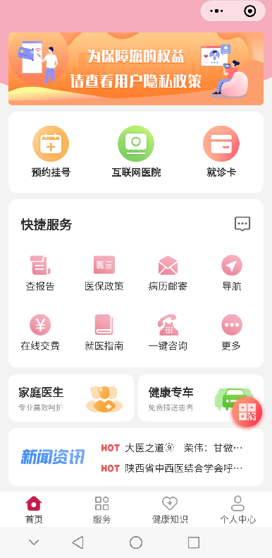 除原有預(yù)約掛號(hào)、互聯(lián)網(wǎng)醫(yī)院、查報(bào)告、電子就診卡、院內(nèi)導(dǎo)航等服務(wù),本次更新新增健康專車、家庭醫(yī)生等便捷功能。讓您享受就醫(yī)一站式全流程。