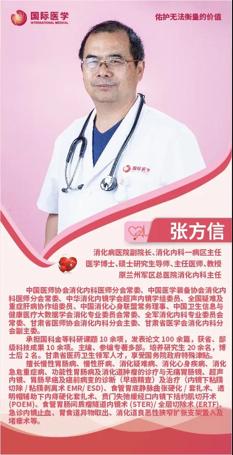 張方信擔(dān)任中國(guó)醫(yī)師協(xié)會(huì)消化內(nèi)科醫(yī)師分會(huì)常委,中國(guó)醫(yī)學(xué)裝備協(xié)會(huì)消化內(nèi)科醫(yī)師分會(huì)常委,中華消化內(nèi)鏡學(xué)會(huì)超聲內(nèi)鏡學(xué)組委員,中華消化心身聯(lián)盟常委,全國(guó)疑難及重癥肝病協(xié)作組委員,全軍消化內(nèi)科專業(yè)委員會(huì)常委等職務(wù)。從醫(yī)四十余載,他對(duì)慢性胃腸病、慢性肝病、消化疑難病、消化心身疾病、消化急危重癥病與消化道腫瘤具有豐富的診治經(jīng)驗(yàn)。擅長(zhǎng)超聲內(nèi)鏡、胃腸早癌內(nèi)鏡精查及其內(nèi)鏡下微創(chuàng)治療。