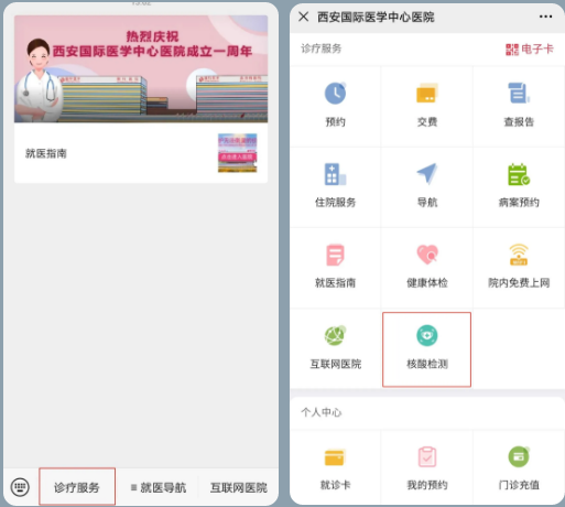有需要住院、陪護的應檢盡檢或愿檢盡檢人群,可關注“西安國際醫(yī)學中心醫(yī)院服務號”后,在【診療服務】——【核酸檢測】功能中自助開單,支付后前往西安國際醫(yī)學中心醫(yī)院急診門口預檢分診點北側核酸檢測室完成采樣檢測。檢測結果可在西安國際醫(yī)學中心醫(yī)院服務號——【診療服務】——【查報告】中查看,也可在“西安市民一碼通”——【核酸結果查詢】中查看。