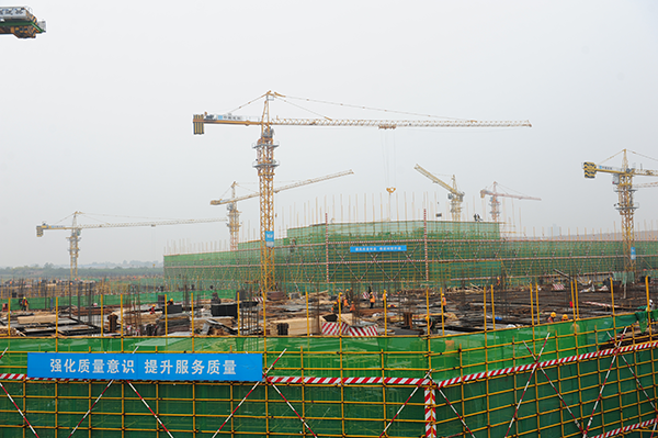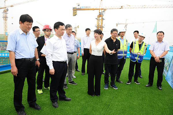隨后李毅一行在史總帶領(lǐng)下,來到工地現(xiàn)場的二層觀景平臺,面對規(guī)模宏大,塔吊林立的建筑現(xiàn)場,看到項目整體浮出地面,中心醫(yī)技樓已建至二層,李書記對項目建設(shè)進(jìn)度表示驚喜,同時對建設(shè)管理表示肯定。期間,史總結(jié)合施工現(xiàn)場和效果圖為李書記詳細(xì)介紹了國際醫(yī)學(xué)城的建設(shè)架構(gòu),功能劃分等情況,之后還就規(guī)劃建設(shè)的“一心兩翼 天使之城”健康中國小鎮(zhèn)的設(shè)計理念,“五位一體”功能布局等做了詳細(xì)介紹和說明。