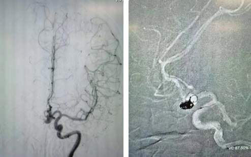 腦血管較外周血管更為脆弱、迂曲,對術(shù)者的操作技術(shù)及精準(zhǔn)性要求特別高。術(shù)中,陸丹醫(yī)生通過股動脈穿刺、置入微導(dǎo)管,再通過微導(dǎo)管將彈簧圏送入動脈瘤腔內(nèi),利用彈簧圈的機(jī)械閉塞作用,達(dá)到防止動脈瘤破裂的目的。術(shù)后,患者各項生命體征平穩(wěn)。