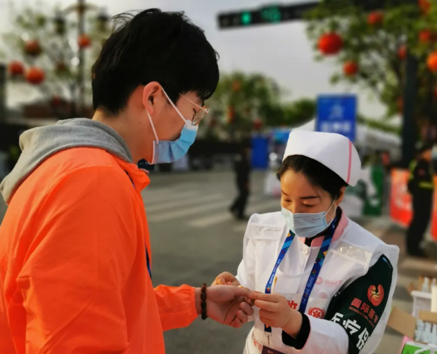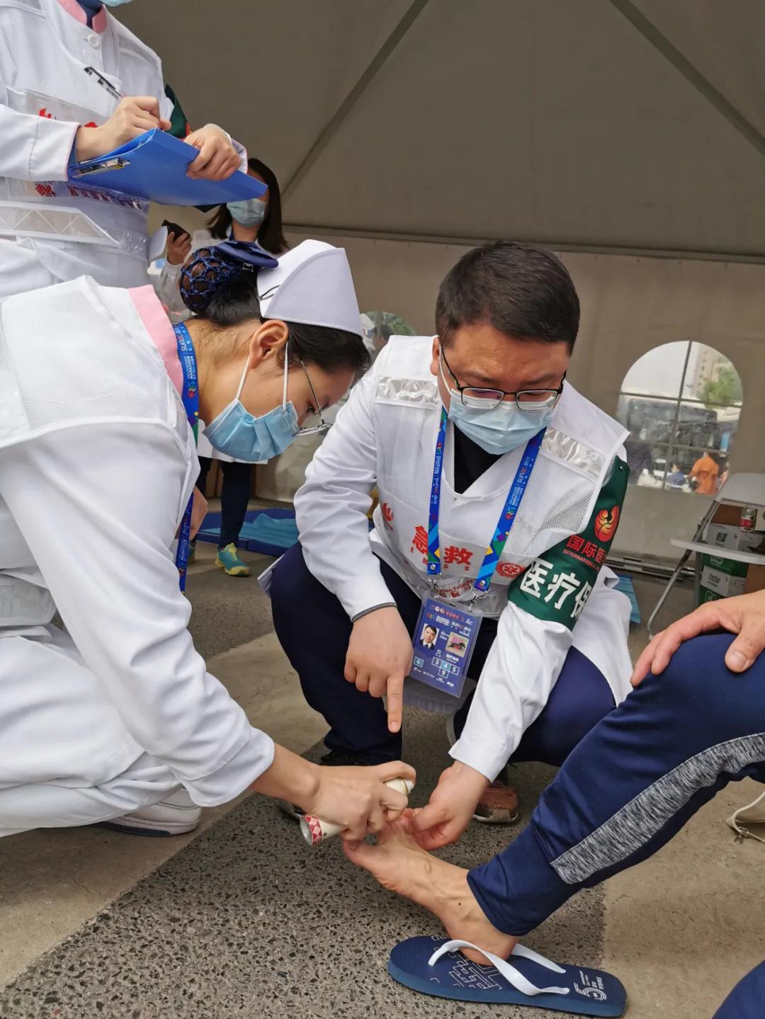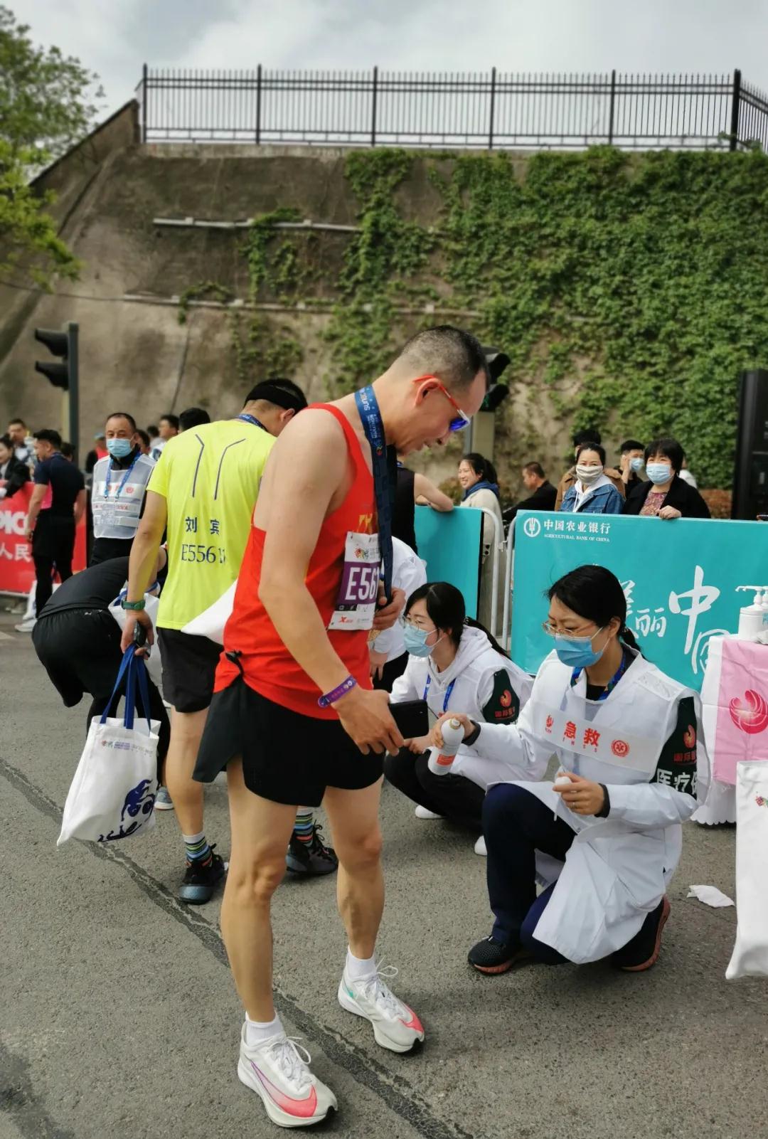 “醫(yī)生,我扭傷了腳踝,麻煩幫忙看看”,“護士,麻煩噴一些運動冰肌噴”……9點開始,奔跑大軍陸續(xù)抵達,涂抹凡士林、提供糖鹽水、處理扭傷抽筋等醫(yī)療需求均得到回應,醫(yī)護人員各司其職,對運動員開展巡回指導和賽后恢復工作。