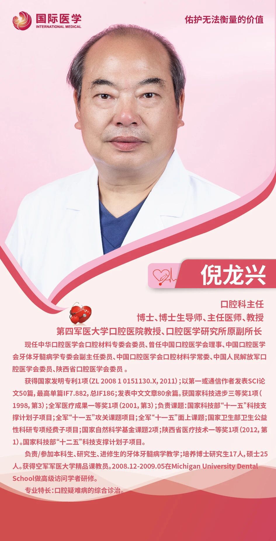 在動物世界中,牙齒是進食、戰(zhàn)斗、彰顯實力的工具,失去牙齒就意味著失去生命。人類進化到今天,牙齒除了咀嚼、輔助發(fā)音、面型美觀功能外,更是全身健康的晴雨表。心血管疾病、糖尿病、消化道疾病、阿爾茨海默病都與牙齒健康息息相關(guān)。據(jù)世界衛(wèi)生組織(WHO)報告:齲病及其繼發(fā)病是繼癌癥、心血管疾病之后危害人類健康的第三大非傳染性疾病。西安國際醫(yī)學(xué)中心醫(yī)院口腔科主任倪龍興從醫(yī)三十多年,孜孜不倦、兢兢業(yè)業(yè),用心守護著人們的牙齒健康。
