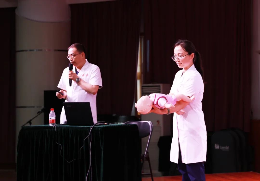 在多功能廳,王彬榮副主任進行理論授課;呂玉珠醫(yī)生、張榮榮護士長、許哈克分別進行了成人、兒童、嬰兒心肺復蘇術(shù)(CPR)模擬演練、體外自動除顫器(AED)的使用、海姆立克法、嬰兒氣道梗阻的緊急處理方法等操作演示,并以互動的方式邀請12名學生代表上臺進行了操作練習,老師們現(xiàn)場進行一對一的指導,為大家解答各種疑問,使他們對現(xiàn)場心肺復蘇術(shù)的全過程有了更加深刻的理解,也使學生們基本掌握了心肺復蘇法的操作技能。