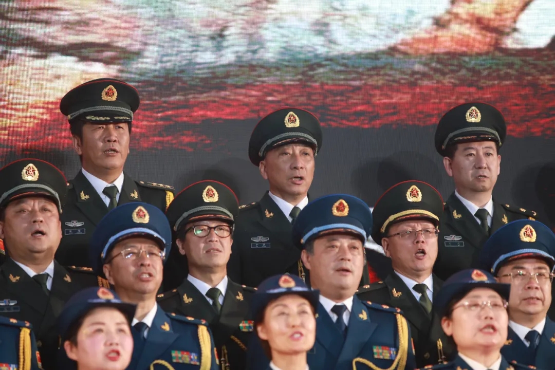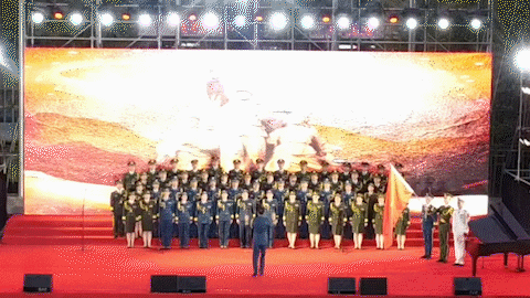 “一二一”,演出開(kāi)始,由71名退役軍官組成的退役軍人合唱團(tuán),在尹強(qiáng)院長(zhǎng)的帶領(lǐng)下,邁著整齊的步伐,喊著響亮的口號(hào),雄赳赳,氣昂昂走上舞臺(tái)。