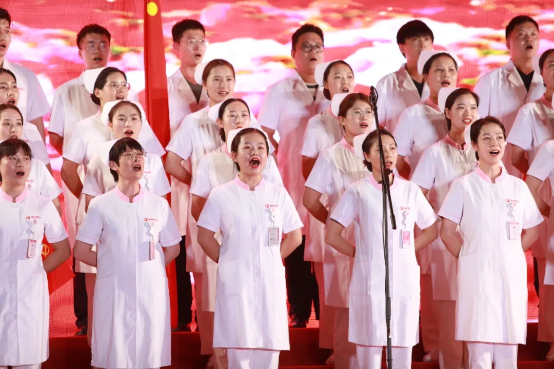 “夜半三更喲盼天明,寒冬臘月喲盼春風(fēng)……”合唱團(tuán)用歌聲抒發(fā)對(duì)偉大祖國(guó)的深深至愛(ài),傾訴對(duì)醫(yī)學(xué)事業(yè)的拳拳之情。在領(lǐng)唱的帶領(lǐng)下,大家分男女聲部進(jìn)行輪唱,群情激昂,歌聲嘹亮。在全場(chǎng)的掌聲中,大家揮舞起手中的黨旗,抒發(fā)對(duì)祖國(guó)的熱愛(ài)。