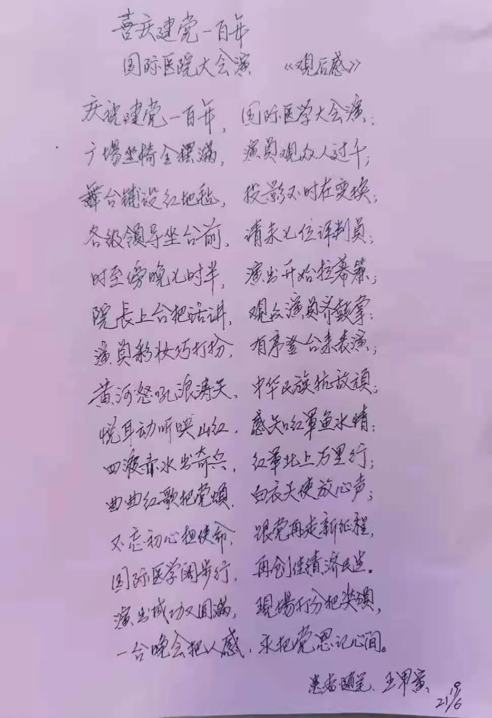 “曲曲紅歌把黨頌,白衣天使放心聲;不忘初心擔(dān)使命,跟黨再走新征程;國(guó)際醫(yī)學(xué)闊步行,再創(chuàng)佳績(jī)濟(jì)民生……” 一位患者在觀看演出后,深情寫下這首《觀后感》,為西安國(guó)際醫(yī)學(xué)中心醫(yī)院點(diǎn)贊。