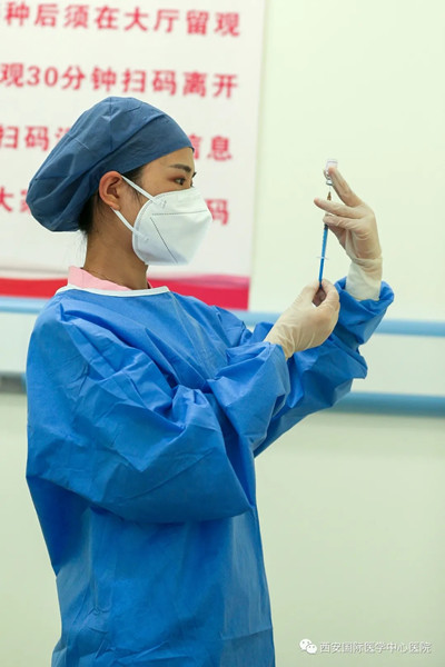 掃碼,拆開(kāi)包裝,取出疫苗,拿出一次性針頭,扎進(jìn)瓶中,抽出液體,注射到接種對(duì)象胳膊上……今天的這位接種者,是西安國(guó)際醫(yī)學(xué)中心醫(yī)院護(hù)士楊婕接種的第13230人。