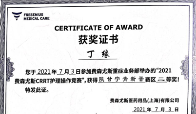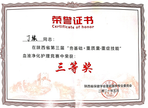 2021年5月,陜西省保健學(xué)會(huì)重癥醫(yī)學(xué)專業(yè)委員會(huì)舉辦了第三屆《“夯基礎(chǔ)?重質(zhì)量-重癥技能”血液凈化護(hù)理技能競(jìng)賽》。丁緣經(jīng)過激烈角逐,從陜西省21家醫(yī)院的24名選手中脫穎而出,榮獲三等獎(jiǎng),拿到了全國(guó)聯(lián)賽的入場(chǎng)券。
