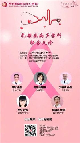為方便患者就醫(yī),提高群眾乳腺健康意識(shí),由西安國際醫(yī)學(xué)中心醫(yī)院腫瘤醫(yī)院、甲乳外科、放射治療中心、影像診療中心、超聲診療中心多位知名專家組成團(tuán)隊(duì),為廣大乳腺疾病患者提供全面、專業(yè)及個(gè)體化診療,并提供免費(fèi)乳腺超聲和骨密度檢查,歡迎掃碼報(bào)名。
