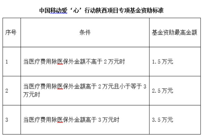 (三)項目實行“屬地醫(yī)保 慈善捐助 合作醫(yī)院減免”三結(jié)合的全額資助模式,受助患兒應(yīng)在合作醫(yī)院首先進(jìn)行醫(yī)保結(jié)算;醫(yī)保結(jié)算剩余部分,由中國移動愛‘心’行動專項基金按最高限價標(biāo)準(zhǔn)進(jìn)行結(jié)算,其余超出治療費用由合作醫(yī)院減免,同一救助對象1年內(nèi)只給予一次救助。