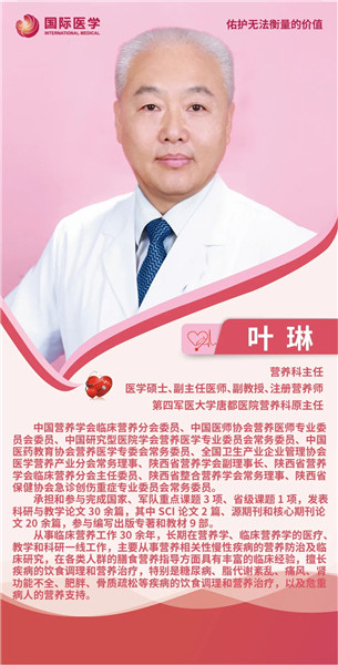 第四軍醫(yī)大學(xué)碩士畢業(yè)后,葉琳進(jìn)入唐都醫(yī)院營養(yǎng)科工作,憑借豐富的臨床經(jīng)歷和積累的營養(yǎng)指導(dǎo)經(jīng)驗,一步一個腳印,從普通醫(yī)生做到科主任,一干就是近二十年。葉琳在疾病的飲食調(diào)理和營養(yǎng)治療方面經(jīng)驗豐富,尤其擅長糖尿病、脂代謝紊亂、痛風(fēng)、腎功能不全、肥胖、骨質(zhì)疏松等疾病的飲食調(diào)理和危重病人的營養(yǎng)支持。
