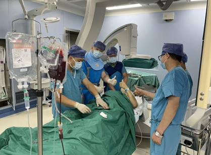 2021年8月16日21:30,消化內(nèi)科五病區(qū)接呼吸科會(huì)診,無(wú)誘因反復(fù)黑便10年的黨叔,因嘔血便血發(fā)生失血性休克,希望科室能通過(guò)介入手術(shù)快速找到病人出血原因并止血。時(shí)間就是生命,李瑞軍主任毫不猶豫從家趕來(lái),帶著住院總李冰醫(yī)生,把所有能想到的可能引起病人出血的腹腔內(nèi)血管找了個(gè)遍,雖然沒(méi)有找到確切誘發(fā)出血的血管,但發(fā)現(xiàn)內(nèi)臟多發(fā)動(dòng)靜脈血管畸形。凌晨5點(diǎn),李主任多次電聯(lián)韓院長(zhǎng),反復(fù)討論患者病情,決定先栓塞部分血管??墒欠祷夭》坎坏揭恍r(shí),病人再發(fā)黑便,血壓掉到70/30mmHg,心率130-160次/分,血氧飽和度測(cè)不出,為預(yù)防窒息,急行氣管插管輔助通氣治療!