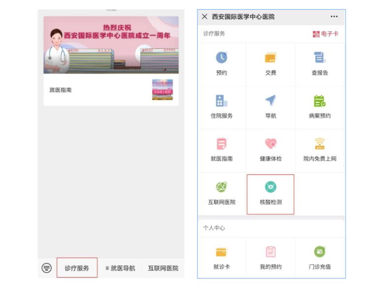 醫(yī)院核酸檢測(cè)已開(kāi)通線(xiàn)上預(yù)約,大家可通過(guò)“西安國(guó)際醫(yī)學(xué)中心醫(yī)院服務(wù)號(hào)”微信公眾號(hào)進(jìn)行預(yù)約。