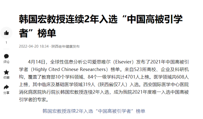 陜西老年健康報(bào):韓國宏教授連續(xù)2年入選“中國高被引學(xué)者”榜單