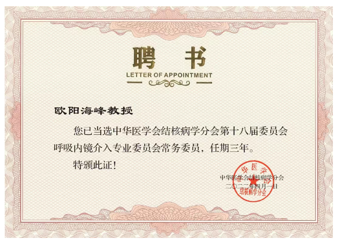 2022年4月,中華醫(yī)學會結核病學分會進行換屆工作。西安國際醫(yī)學中心胸科醫(yī)院歐陽海峰副院長當選為“呼吸內(nèi)鏡介入專業(yè)委員會常務委員”。