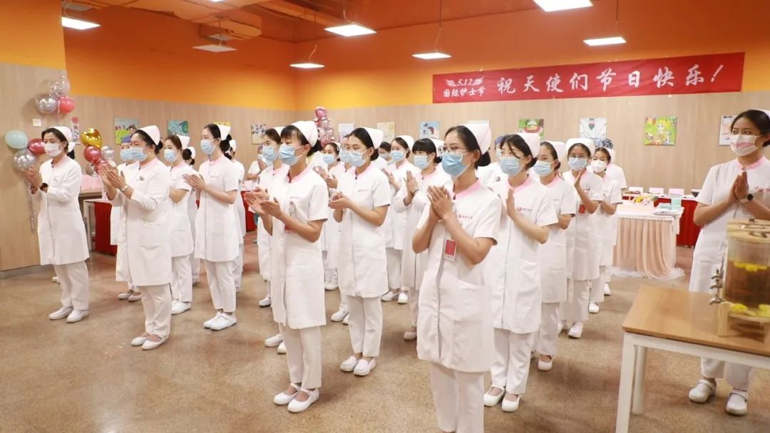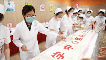 醫(yī)護(hù)餐廳為護(hù)理兄弟姐妹們精心準(zhǔn)備了60*400cm的蛋糕?!白4蠹夜?jié)日快樂(lè)!”李武平副院長(zhǎng)、張敏主任及各科室護(hù)士長(zhǎng)共同切蛋糕送祝福。