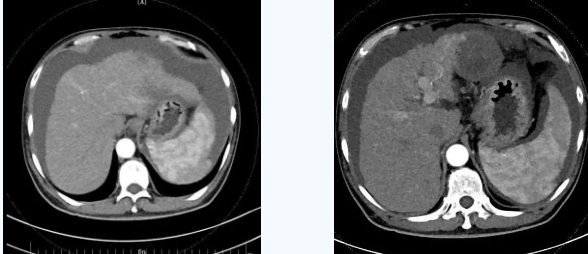 術(shù)后一個(gè)月秦先生來(lái)院復(fù)查,腹水已明顯較前減少,精神和飲食較術(shù)前明顯好轉(zhuǎn)。