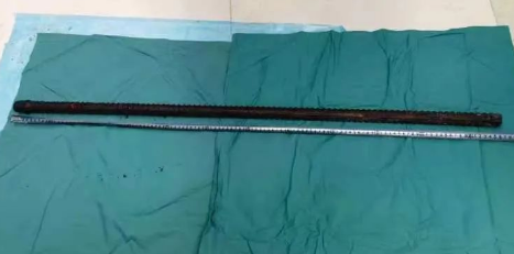 情況緊急!術(shù)中探查后發(fā)現(xiàn),長(zhǎng)120cm直徑3cm的螺紋鋼經(jīng)患者右側(cè)會(huì)陰部穿入,傷及直腸,途徑膀胱后方,左側(cè)髂總動(dòng)靜脈之間傷及左腎后,經(jīng)胰腺后方在肝脾之間穿破膈肌,在下肺靜脈前方穿入左肺穿破氣管及左右主支氣管膜部,止于主動(dòng)脈弓下水平,穿入體內(nèi)的部分達(dá)到75cm。