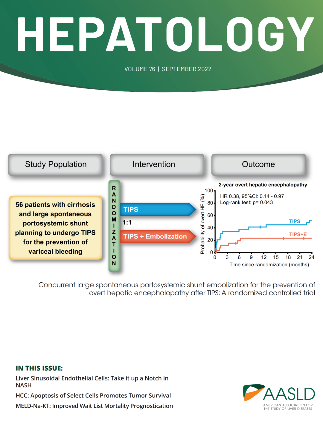 新近,西安國際醫(yī)學(xué)中心醫(yī)院消化病醫(yī)院韓國宏教授團隊的一項隨機對照試驗“經(jīng)頸靜脈肝內(nèi)門體靜脈分流術(shù)(TIPS)聯(lián)合自發(fā)性門體分流封堵預(yù)防術(shù)后顯性肝性腦病”的論著被最新一期的Hepatology雜志(IF=17.29,JCR:Q1)遴選為9月份封面文章(圖1)。該研究顯示TIPS聯(lián)合粗大分流道封堵能夠有效降低TIPS術(shù)后顯性肝性腦病的發(fā)生率,且不增加門靜脈高壓、分流道功能障礙和其他不良事件的并發(fā)癥風(fēng)險[1]。