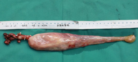 手術(shù)刀游走在人體血管的江河湖海,在完全游離肝臟顯露全段下腔靜脈后,依次有序阻閉“主干道”的血流供應(yīng),最后阻斷肝臟血供,于肝臟尾狀葉肝短靜脈下方切開下腔靜脈,借助經(jīng)食管超聲實(shí)時(shí)嚴(yán)密的監(jiān)控,經(jīng)下腔靜脈切口順利取出位于右心房、膈上下腔靜脈、肝后下腔靜脈內(nèi)的瘤栓,隨即阻閉膈下腔靜脈,同時(shí)恢復(fù)肝臟血流“通航”。手術(shù)刀繼續(xù)向下行進(jìn),一點(diǎn)一點(diǎn)地剝離下腔靜脈遠(yuǎn)心段直至右側(cè)髂總靜脈、右側(cè)髂內(nèi)靜脈內(nèi)的瘤栓,最終,一根長(zhǎng)達(dá)35cm、最寬直徑5cm的腔靜脈瘤栓被完整取出!