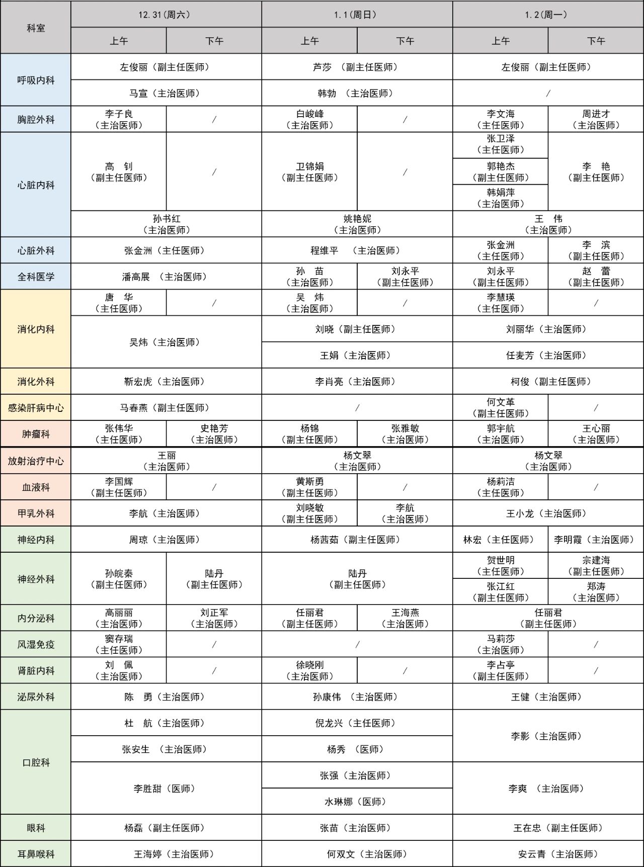 元旦期間門診出診表