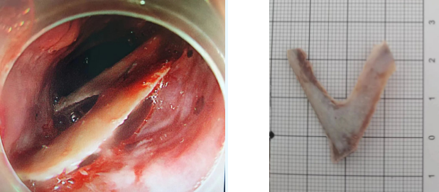 上午11時(shí),在麻醉手術(shù)中心的全力配合下,張惠林醫(yī)生操作內(nèi)鏡,可見異物完全坎頓到食管壁內(nèi),黏膜完全覆蓋異物,經(jīng)多次調(diào)整角度及牽拉方向,用時(shí)10分鐘,將骨頭安全取出。從入院后到異物取出用時(shí)僅1小時(shí)。