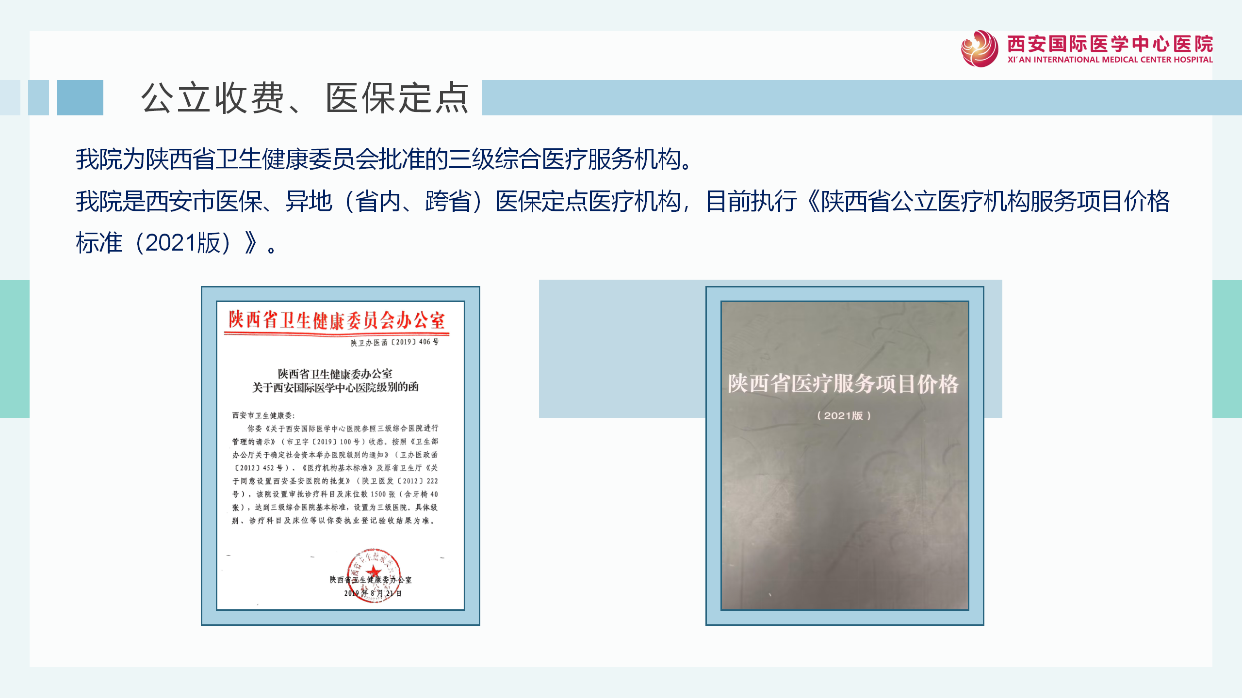 • 國(guó)內(nèi)首家高分通過(guò)JCI認(rèn)證的醫(yī)院 西安國(guó)際醫(yī)學(xué)中心醫(yī)院為國(guó)內(nèi)首家高分通過(guò)JCI認(rèn)證的醫(yī)院,該稱(chēng)號(hào)由國(guó)際醫(yī)療機(jī)構(gòu)認(rèn)證聯(lián)合委員會(huì)頒布。